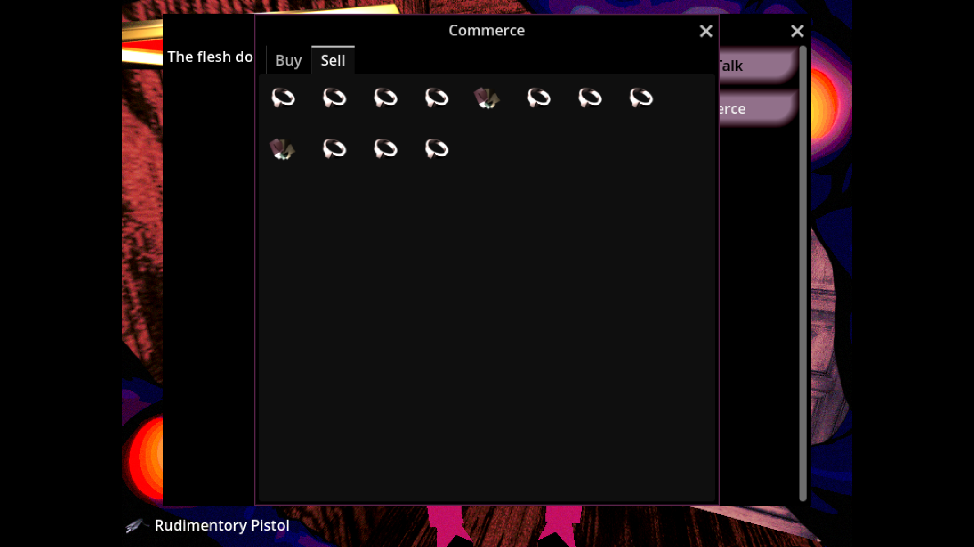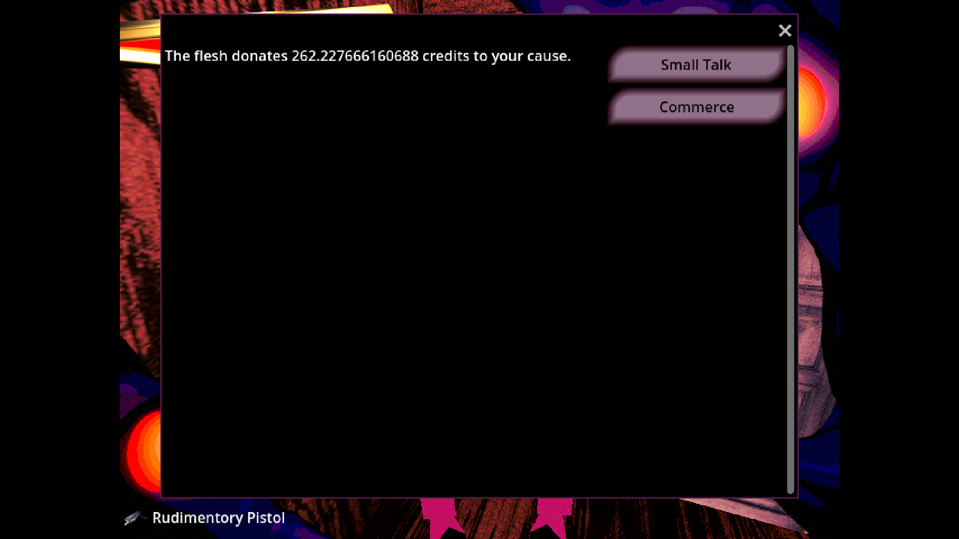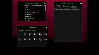 - a dialog system that currently has bartering, repair for in-game currency (if your "hardware" skill isn't high enough) and also a "small talk" feature inspired that strings together procedurally-generated sentences that are as over-the-top-melancholic as they are surreal and nonsensical